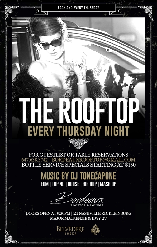 Bordeaux Rooftop and Lounge is a brand new rooftop and lounge opening in Vaughan. The venue is an upscale establishment dedicated to providing the best customer service and experience the night club industry has to offer. Say no to downtown traffic, rude security, poor service, expensive parking and young kids ruining the nightlife experience. Bordeaux promises to provide a fun, energetic, and luxury experience.Contact